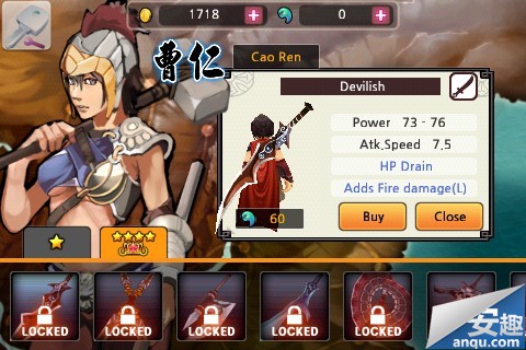 首先我们需要打过3关,当作熟悉操作,打过三关后会出来一个曹仁,就是图上第2个还有提示,到4星武器的界面,可以看到武器的价格是60蓝玉。