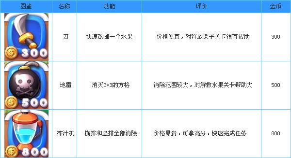 道具可以通过闯关来获得,你也可以去购买。刀可以切掉无关的水果,产生更多的连击,分数更高。榨汁机建议少使用,价格昂贵,其实操作熟练很容易拿三星评分的。