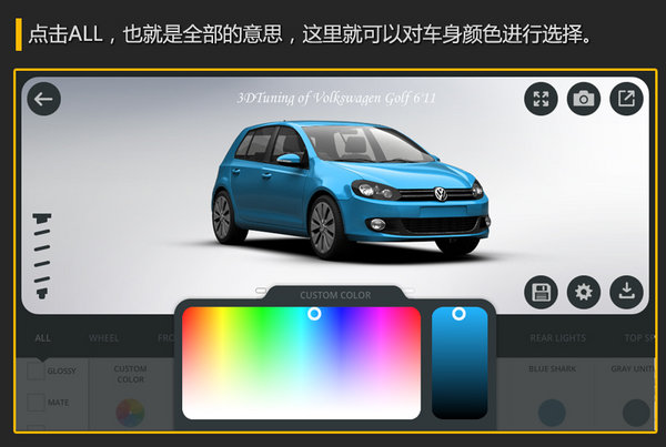 总结:经过差不多5分钟的时间,对这款软件编者玩的也不算非常娴熟,很多功能目前也没有完全琢磨透彻,不过我也对这辆普通高尔夫 (详情 图片 报价)从车身颜色、车身高度降低 、前后保险杠、侧围、大灯、中网、前机盖、轮毂、挡风玻璃膜、尾翼等等几处改装,实现了翻天覆地的变化,这样一辆独一无二的高尔夫,您是不是也有好的改进建议呢?那么你现在也下载3D Tuning一起加入改车行列吧。