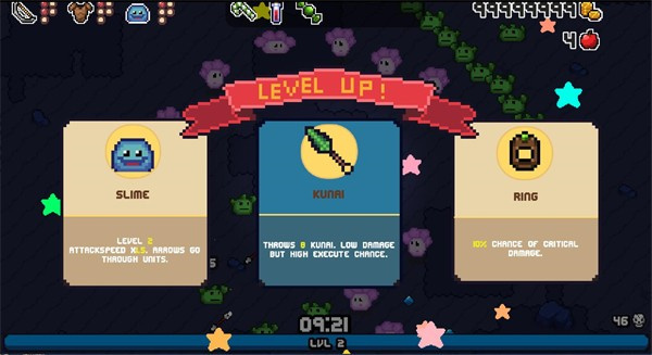 3、通过收集奖励,金币以及水果来升级自己的武器,并为自身角色和史莱姆同伴购买强大的神器和装备。