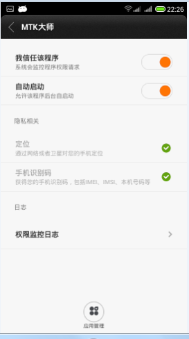 接下来我们也要保证手机有ROOT权限 并且像 MIUI 乐蛙 等ROM有安全中心,那我这边已MIUI为例,如图