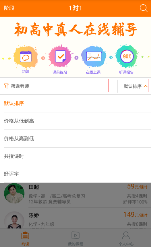 可以自由选择排序方式来选择老师,根据价格、授课时长、好评率等