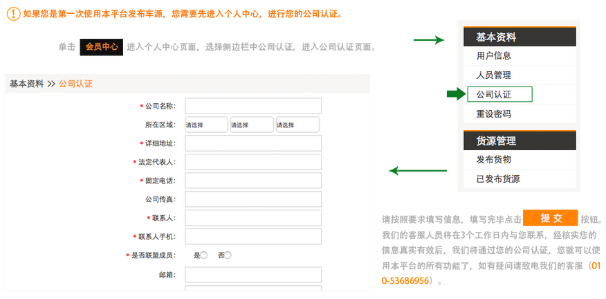1、如果您是第一次使用本平台发布车源,您需要先进入个人中心,进行公司认证