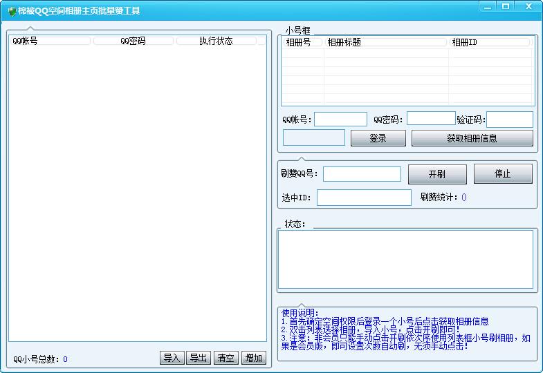 棉被QQ空间相册主页批量赞工具是2016年最新推出的空间相册刷赞软件,这款软件专为QQ空间用户设计制作,它可以帮助广大空间用户一键批量刷QQ空间相册主页赞,软件操作简单,下面有小编为大家带来的具体使用方法,欢迎各位下载使用!