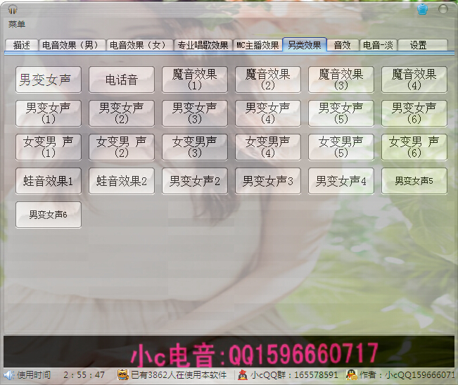 小c一键电音软件使用非常方便简单,里面的500多种效果,都是平时精心调试的,新老客户只要在界面选择自己想要的效果直接左键点击切换就可以了。