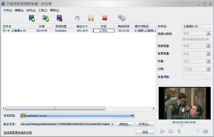 万能快转视频转换器是一款功能强大的全能视频格式转换软件,这款软件支持多种视频格式转换。万能视频转换器可以将RM、RMVB、AVI、WMV、MPG 、MPEG、FLV、3GP、MP4、SWF、ASF、DIVX、XVID、3GP2、FLV1、MPEG1、MPEG2、MPEG3、MPEG4、H264等视频格式转换,用于各种mp4播放机、手 机、psp游戏机、iPod、iPod、dvd、iphone机、高清电视等设备播放。这是一款用于专业视频转换和压缩的软件,其采用全新的国际一流编解 码技术,转换质量和速度都处于国内领先技术,具有转换速度快,支持批量转换,上手容易,操作简单易用等特点,是电脑常用必备视频转换工具。