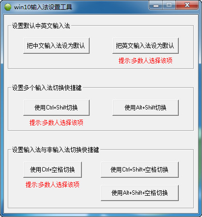 win10输入法设置工具是一款专门为Win10用户打造的输入法设置工具,这款软件可以帮助你快捷设置WIN10系统默认输入法,快捷设置多个输入法切换的快捷键,快捷设置输入法与非输入法切换的快捷键等等。软件操作简单,欢迎免费下载使用。