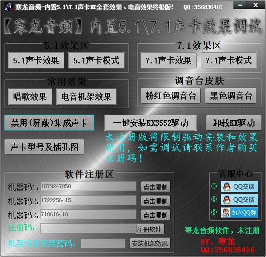 寒龙内置声卡电音调试支持所有内置、外置声卡调试: 创新5.1、7.1、客所思KX-2传奇版、究极版、金麦克、北蓝鼠、森频、ISK-UK400、魅声、ESI、艾肯、舒音歌霸、飙歌达人等所有外置声卡!