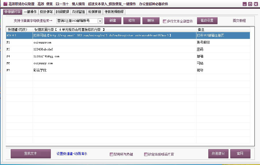 高效职场办公助理是一款职场商务人士高效使用电脑的必备工具,极致方便的桌面便笺,方便您的日程安排,倒计时闹钟,依据蕃茄工作法打造的高效时间管理功能,还有其它一键搜索,一键翻译,一键文本录入,网址管理,程序管理及一键运行,等高效功能。