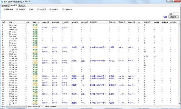 新兴万能域名批量查询软件是一个专为站长推出的批量查询域名软件,这款软件支持多线程批量查询,目前支持280多种域名后缀,可通过配置文件自定义无限扩展、ICP备案批量查询,智能识别验证码、SEO信息查询(可扩展)、域名批量生成、即将过期域名查询、域名定时抢注计划任务。