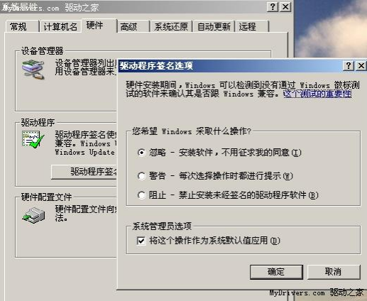 选择“硬件”选项卡,然后单击“驱动程序”中的“驱动程序签名”(见图2)按钮,在弹出的对话框中选择“忽略-安装软件,不用征求我的同意(I)”,这时应注意把“系统管理员选项”下的“将这个操作作为系统默认值应用(D)”前的复选框也选中,最后单击“确认”按钮退出即可,以后再安装设备驱动程序就会畅通无阻了。