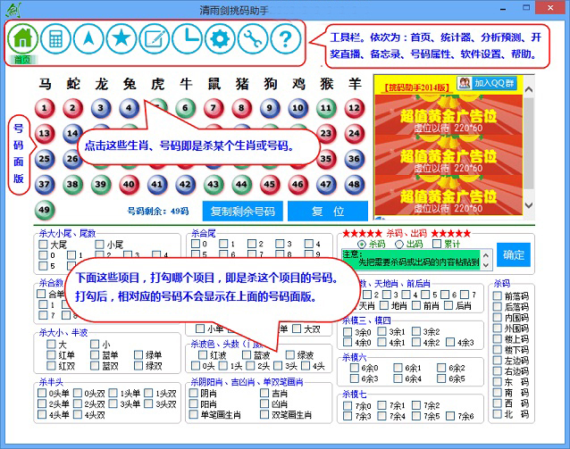 勾选哪一个项目,就是把那个项目的号码给杀掉。如果想杀掉某个生肖,直接点击号码面版上的那个生肖字即可。