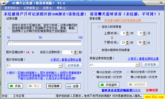 · 自定义记录时间,自定义记录压缩比例,还可以自定义记录存放位置.方便灵活!