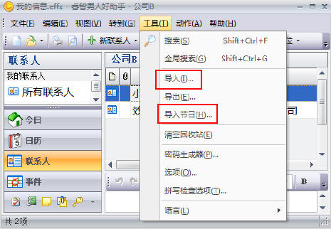 1.进入联系人模块后,您可以导入以前保存在Excel中的联系人信息。在导入前,请将Excel文档另存为逗号分隔文件(CSV)。然后单击工具->导入。(提示:请确保待导入的逗号分隔文件的第一行为列标题行。)
