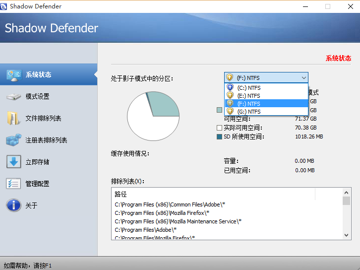 Shadow Defender是一款小巧却功能强大的保护程序,支持多分区,支持转储,支持排除。虽然大家都熟悉Powershadow(影子系统),但也不妨试试这个Shadow Defender,和Powershadow(影子系统)一样也能防机器狗。软件有着漂亮的界面和直观的设置选项,桌面上的提示标签很漂亮,还可以随时移动并且可以此唤出主界面,给人感觉超棒。特别是在转储和排除方面胜人一筹。