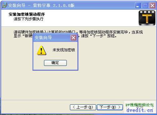 3、出现“未发现加密锁”提示,此时点击“确定”,但是不要点击“下一步”。