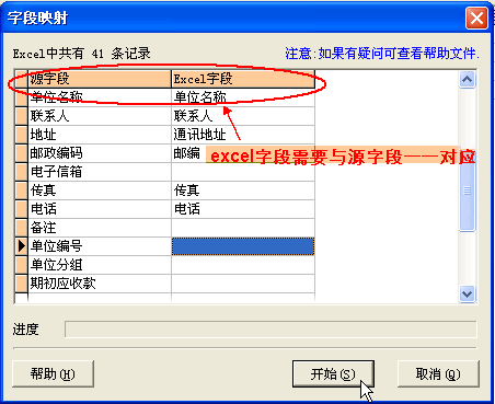 此操作是将以前导出为Excel格式的数据导入到数据库,追加在数据表的末尾,操作时,选中“Excel字段”栏中的字段,再单击选中字段便会弹出下拉选择框,再选择字段,确保“源自段”和“Excel中的字段”一一对应,若两边字段不同,一一对不上,请确保“Excel字段”一边为空,否则会出现错误,然后单击“开始”按钮便开始导入数据。需要注意的是:Excel文件中不能含有数据库中已有的数据(主要指“合同编号”、“合同名称”、“客户编号”等不能有重复数据、也不能为空的字段),否则会出现错误,这时的错误属于正常错误,它只是不将重复的数据导进去,对程序没有太大的影响,若出现错误后,程序死掉,不能正常运行,请关闭程序、或在任务管理器进程中结束程序(Pact.exe)、或注销电脑,重新启动程序便可。