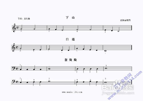 本课弹奏高音谱号的第一间的fa和第二线的sol,很多学员刚开始分不清,在弹《下山》《日落》时特别注意,要用断奏法。以下几首乐曲练习时都要打开进行曲节奏,速度60左右。