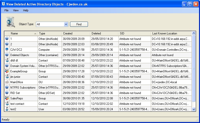 删除文件查找(View Deleted AD Objects)是一款快速找到删除电脑Active Directory对象的工具,只要选择文件对象的类型,就可以一键找到删除所有相关的信息,软件自动匹配信息,所选对象的类型。