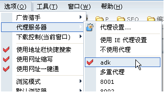 点击菜单中的“选项”,“代理服务器”,选择刚建立的代理。”。