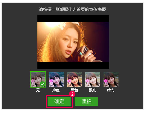 2、选择好视频和音频设备后,进入直播海报的拍摄,同时选择5种不同的滤镜对海报进行处理,上传成功后便可开始直播。 把直播地址(如: //fanxing.kugou.com/1012043)发给好友,让大家一起观赏您的精彩直播