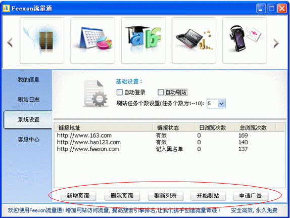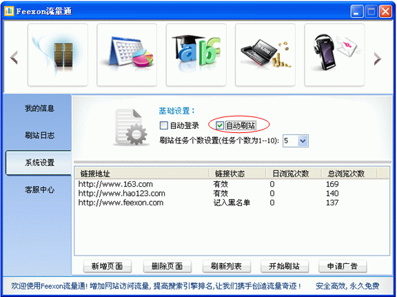 点击“系统设置”→“自动刷站”按钮设置系统自动刷站,它将使您最近刷过的网站进行自动刷新该网站的流量,如下图: