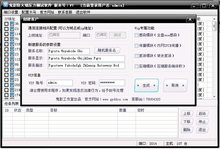 鬼影防火墙压力测试软件是一款能够快速测试防火墙压力的测试软件,压力测试模块稳定不掉机,兼容性非常好,稳定运行,不占用任何资源,防误报能力强,服务端纯SDK打造,无MFC类,注册服务启动,安全稳定,具有高效率发包率,不死锁等特点。