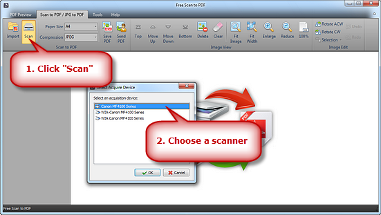 推出免费浏览PDF和扫描仪床上把你的文档。确保它是尽可能直。点击“扫描……“选择一个扫描仪连接到您的计算机并激活程序。