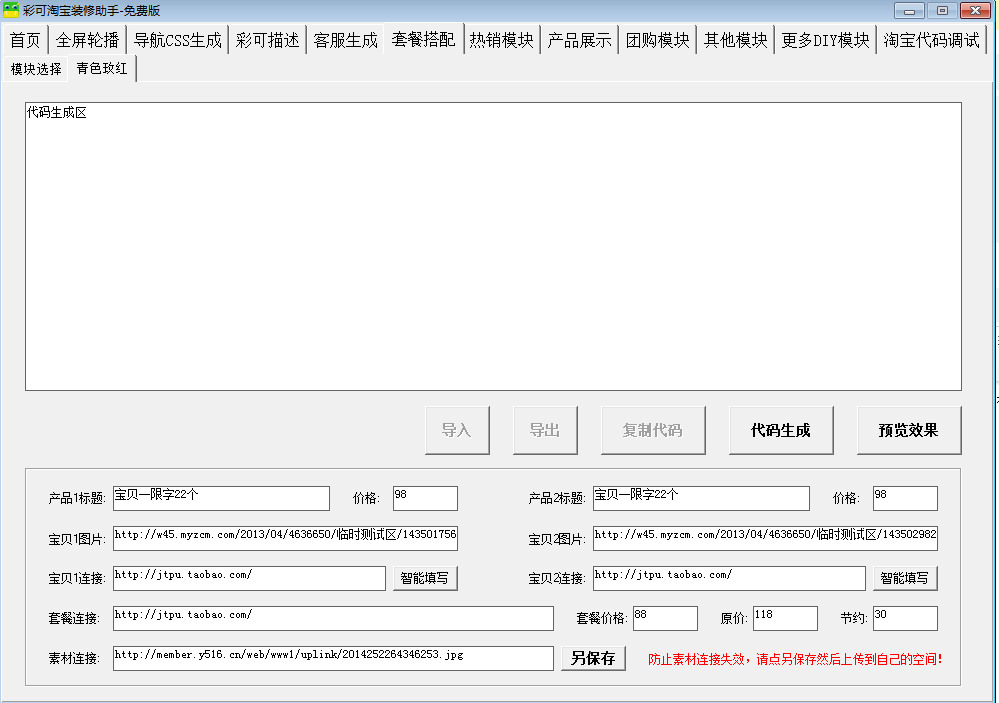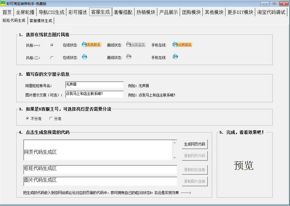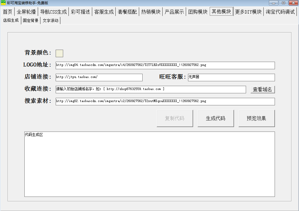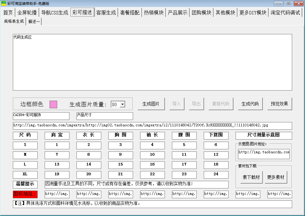 彩可淘宝装修助手是一款免费使用的用来淘宝店铺装修生成代码的工具,软件除了生成常见装修代码之外,比如全屏轮播、导航CSS、客服代码等,还提供许多实用的功能,实用工具,快递查询、计算器;图片处理,PS在线、美图秀秀、上传图片;淘宝大学,开店流程、店铺设置、搜索排名,等等多种实用的信息来帮助用户全方位打造淘宝店铺。
