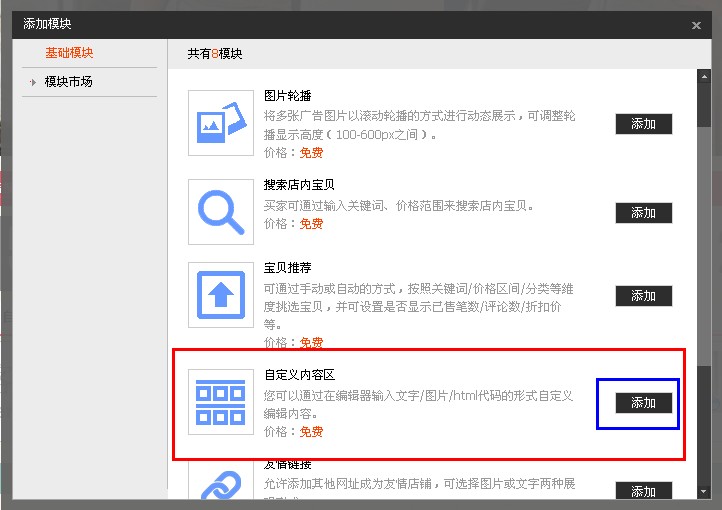 第六:打开卖家中心,店铺装修,进入店铺装修后,鼠标放在950模块上,你就能看到添加模块字样了!