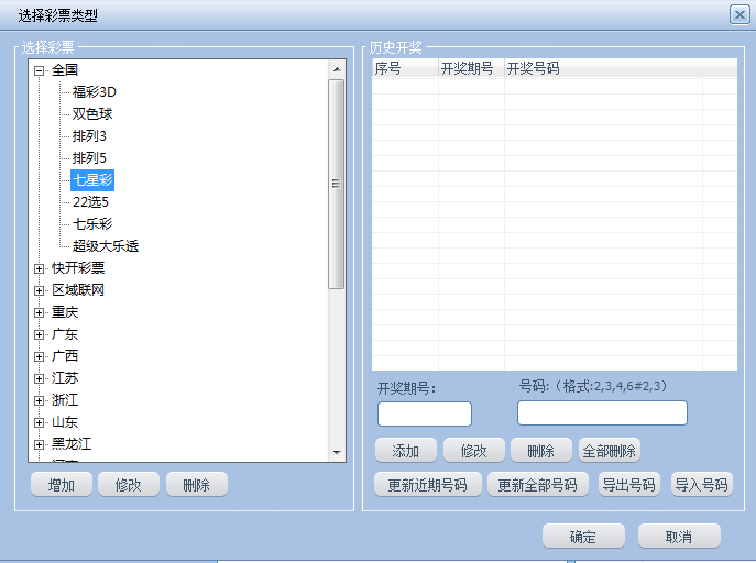 彩票类型选择,区域、历史开奖、更新近期号码、更新全部号码、号码导入导出