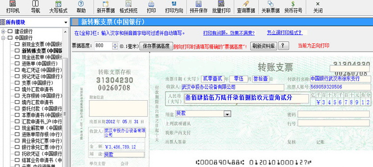 打印支票、现金支票、转账支票、进账单、电汇凭证、业务申请书、现金交款单等100多种票据