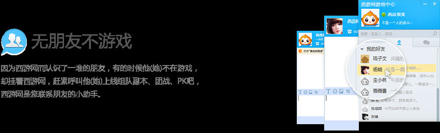因为西游网而认识了一堆的朋友,有的时候他(她)不在游戏。却挂着西游网,赶紧呼叫他(她)上线组队副本、团战、PK吧,西游网是您联系朋友的小助手