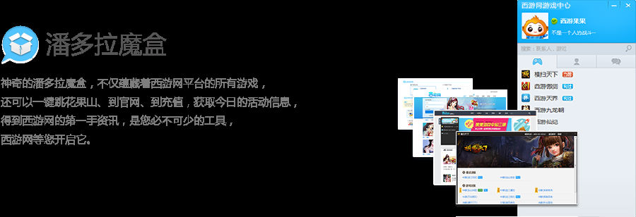 神器的潘多拉魔盒,不仅蕴藏着西游网平台的所有游戏,还可以一键跳花果山、到官网、到重置,获取今日的活动信息,得到西游网的第一手资讯,是您必不可很少的工具,西游网等您开启它。