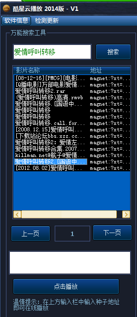 酷星云播放是一款最新可用的免费在线云点播工具,软件自带万能搜索工具,可以进行影片种子在线搜索,搜索出结果之后,在上方输入栏中输入种子地址即可在线播放。