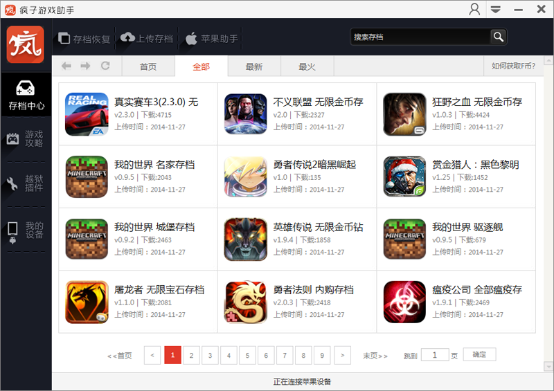 疯子游戏助手是可以将ios游戏存档到电脑上,还有海量游戏存档包可供用户免费使用,不用煞费苦心熬夜通关,想玩哪关就玩哪关,是苹果游戏最好的游戏存档软件。