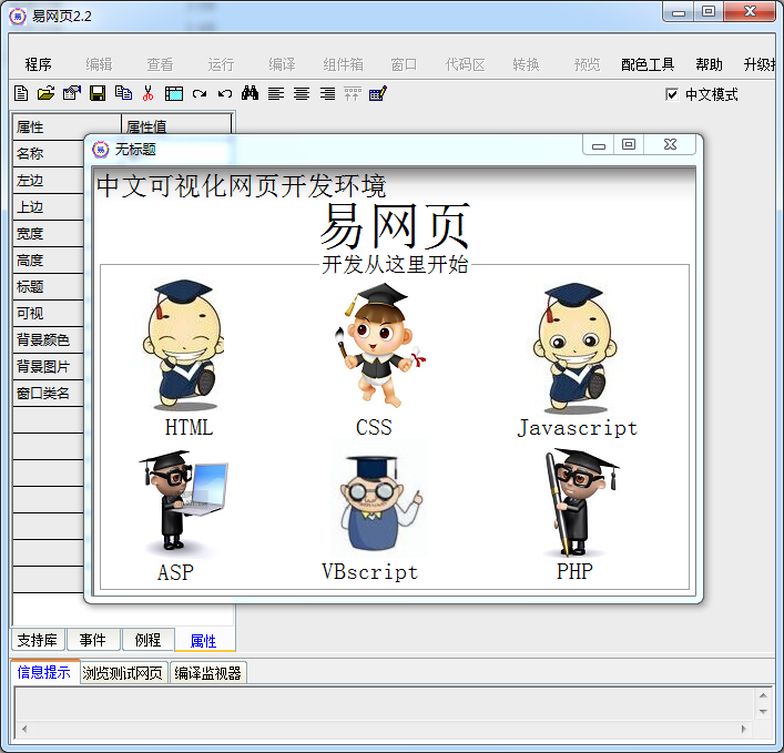 易网页是一款网页编程开发工具,为开发者中文可视化网页环境,快速简单的开发环境,解决英文编程难的问题,本软件是以,中文,中英混合,英文,等开发网页的可视化环境。目标计划,大量的引用组件,减少用户的代码量,不断的智能化。当前的版本 汉化了HTML,CSS,以后汉化Javascript,英文没有任何限制,HTML,CSS,Javascript,PHP,ASP,VBscript 的都支持。