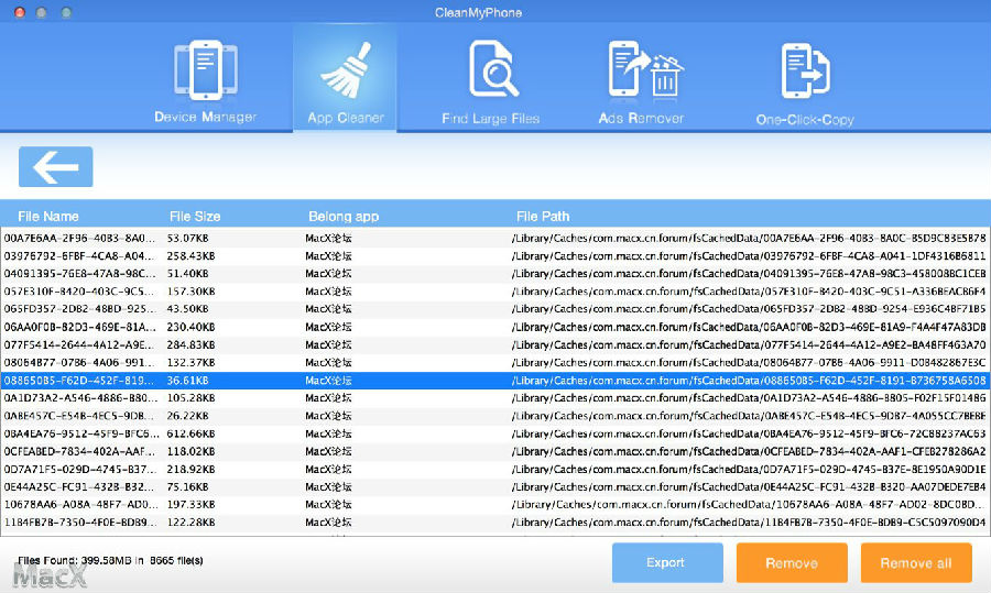 CleanMyPhone for Mac是款苹果电脑垃圾文件清理实用性很强的工具,还支持磁盘管理、应用卸载、删除文档数据、查找大文件等功能,CleanMyPhone的磁盘管理器可以帮助到你的iPhone ,iPad或iPod touch的配置清洁和顺利运行。,组织和管理文件和应用程序。你可以找出究竟占用你的磁盘空间并轻松导出,删除不需要的文件,或汇出,并从您的设备卸载不必要的应用程序。 回收存储空间,并保持您的iDevice运行平稳... CleanMyPhone应用程序清洁器可以帮助你去除像文档和数据,应用程序的Cookie各种临时和无用文件获得更多的存储空间,并在iOS设备上应用程序垃圾文件。