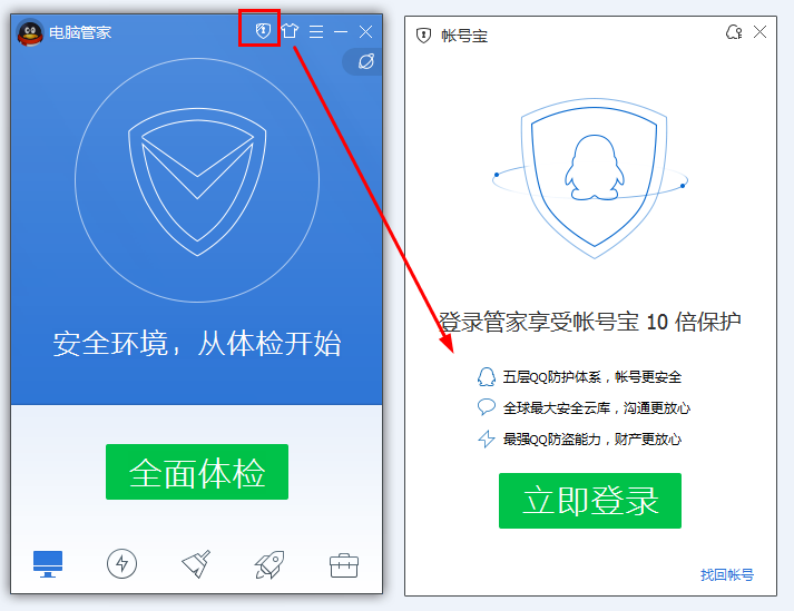 开启电脑管家——帐号宝(电脑管家右上方左起第一个按钮)——立即登陆