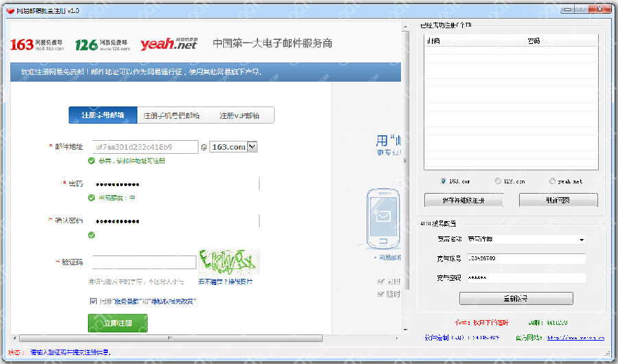 网易163邮箱批量注册机更换最新网页协议,是目前真实可用的一款网易邮箱批量注册工具。支持网易163、126和yeah邮箱批量注册。支持自动换IP和远程验证码识别。可以实现全自动快速批量注册邮箱。