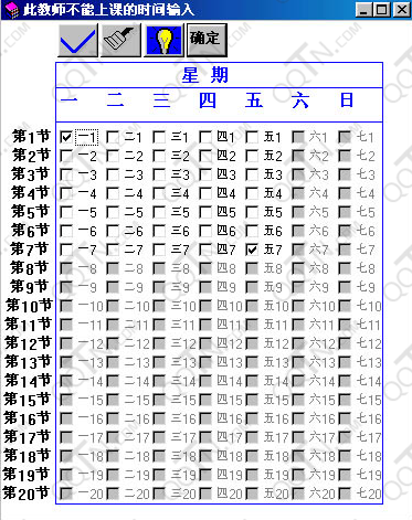 此教师不能上课的时间输入,指课时安排输入中,该教师的该课在一个排课周期内哪些时间不能上课,就输入这些时间,其中时间是以星期几的第几节表示,如星期一的第1节和星期五的第7节该教师不能上课,则用鼠标把“一1”和“五7”项钩选。
