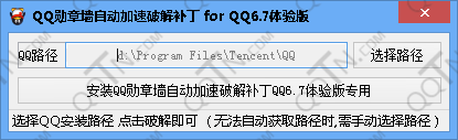 2、打开QQ6.7体验版勋章墙破解补丁,工具会自动获取QQ安装目录,如果无法获取,请手动选择路径