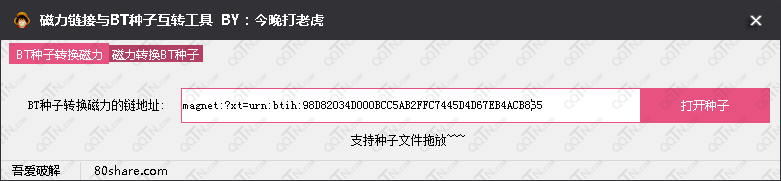 看软件名字大家都应该明白这款软件是干什么的吧。可以实现BT种子与磁力链接相互转换,由于各种原因,有时候需要的资源是BT种子文件或是磁力链接,那么使用本工具就能将这两种类型轻松进行转换。时刻满足你的需求。