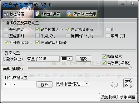 基础设置:操作设置及其它设置、界面设置面板透明度、呼出热键设置