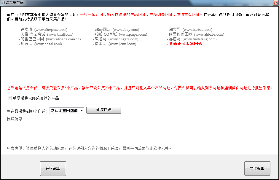 请在下面的文本框中输入您要采集的网址,一行一条,可以输入店铺里的产品网址、产品列表网址、店铺靠谱朗驰娱乐体育网址。