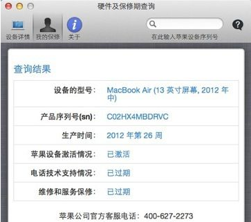 苹果产品保修查询器可以查询所有Mac设备的硬件信息、生产日期、保修信息、激活信息等,包括MacBook Air、MacBook Pro、Retina MacBook、iMac等,软件运行后就会自动获取序列号以及保修信息,并且支持输入 iOS 设备(iPhone/iPad)的序列号查询,所有保修数据来自苹果官网,很实用的一款软件。