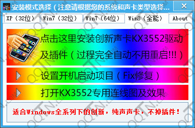 创新声卡KX音效精灵适用于内置声卡、外置声卡、集成声卡不同类型声卡入门驱动安装调试使用。全面支持windows xp、win7、win8系统安装使用。本软件为破解版,附带软件注册机,大家在完成注册安装之后,根据自己的实际情况进行安装调试。