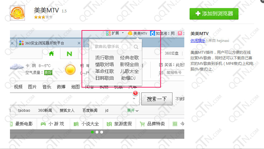 美美MTV插件,用户可以方便的在线欣赏MV歌曲,同时还可以下载自己喜欢的MV歌曲到手机(MP4格式)上和电脑(flv格式)上