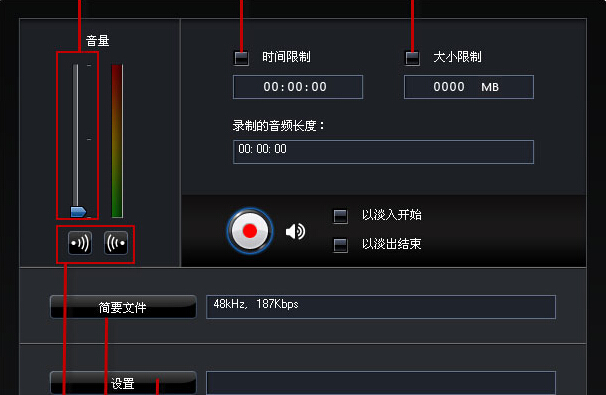 A – 录制音量控制,B – 设置时间限制,C – 设置大小限制,D – 音频设备设置,E – 音频质量设置,F – 淡入/淡出按钮