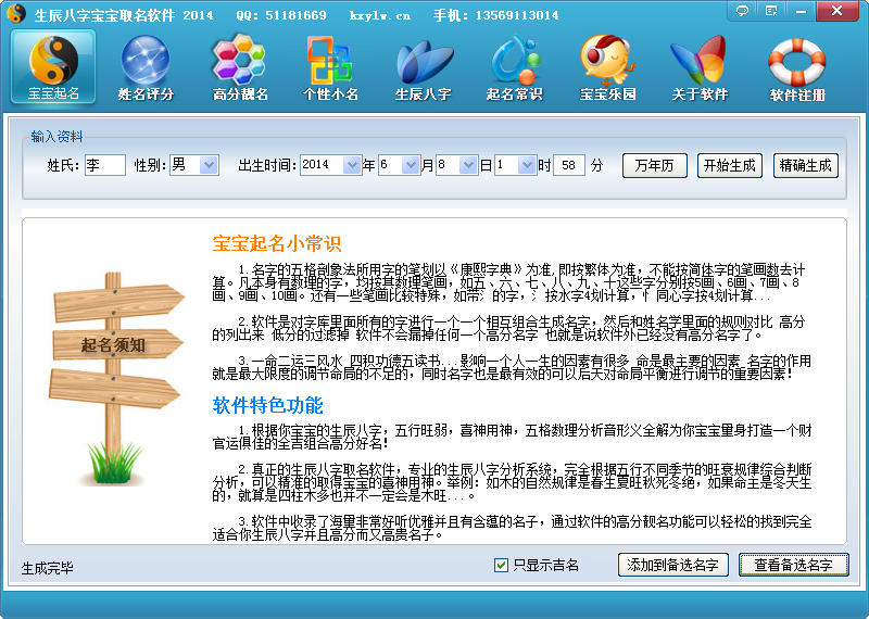 1、 生辰八字宝宝取名软件使用简单,只要你有电脑,安装上本软件你的电脑就会变成一个高分起名专家。通过鼠标简单操作就可以为你的宝宝取一个专业的高分好名。